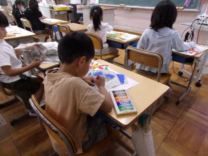 完成間近のようです。破いた様々な紙(色紙・新聞紙など)を使って、作品を作っています。