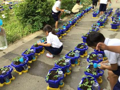朝の支度が終わったら、あさがおに水をあげます。あさがおは、芽が出てきています。