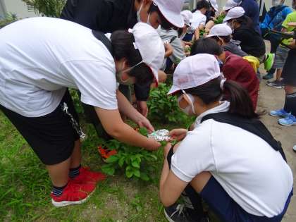 植物に日光が当たると、養分(でんぷん)ができるのかを実験して確かめます。アルミニウム箔で葉を覆って、準備をしています。隙間から日光が入ってしまわないように、しかし、強く覆いすぎて葉を痛めてしまわないように、慎重に作業していました。