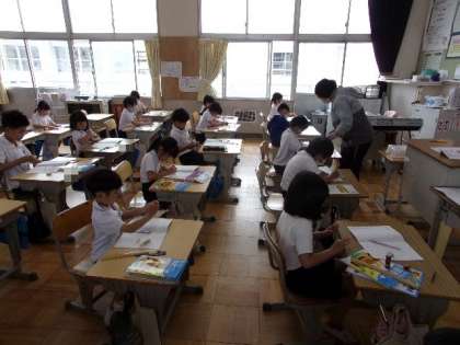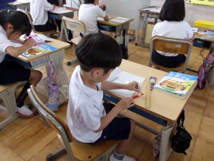 10cmだと思う長さに紙テープ(実際には色紙です)。実際に、どのくらいの長さなのか測ってみると…。10cmの量感をつかむ学習です。もちろん、ぴったりとまでは難しいですが、大体近い長さになっていました。