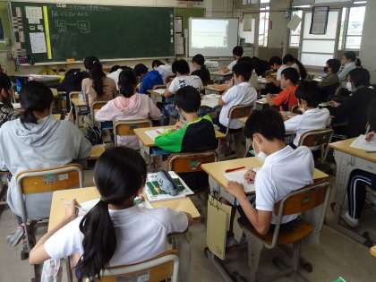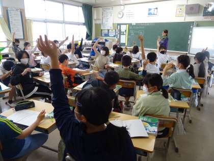 1デシリットルで0.8平方メートルを塗れるペンキがあります。4デシリットルだと、どれだけ塗れるかを考えています。実は、ここまでならば、5年生の算数の範囲なのですが、こうして、式の立て方や計算の仕方を確かめ直すことから、分数のかけ算の学習へ入っていきます。