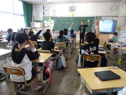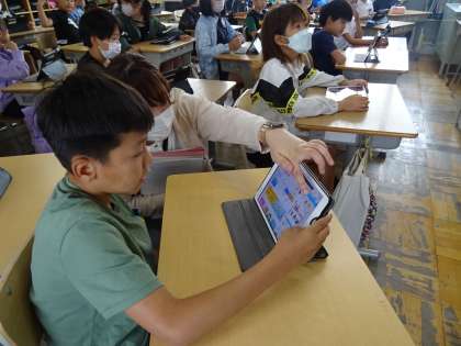 アンケートをタブレットで作りました。ICT支援員さんにも教えてもらいながら、クラスのみんなに聞くアンケートを作り、互いに答え合うことができました。短時間で集計までできて、タブレットのよさを感じられました。