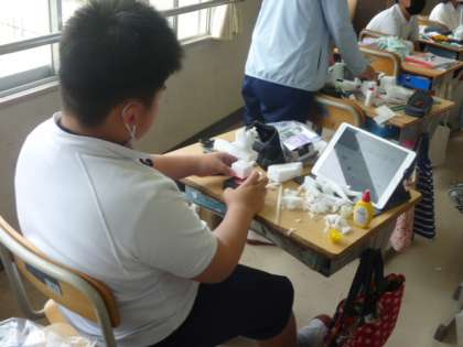 光を当てて、美しく輝く作品を考えます。みんな、あれこれ工夫していました。光が当たったらどうなるのかを考えながら作るというのは、難しそうではありますが、何だかとても楽しそうでした。ちょっと難しいくらいが、子どもたちの意欲が高まるようです。