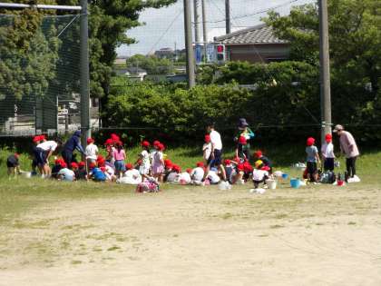 砂場で図工の学習をしました。昨日に比べ、気温も湿度もかなり高い状況だったので、予定していた時間よりは短い活動時間となりましたが、みんな楽しく活動できました。