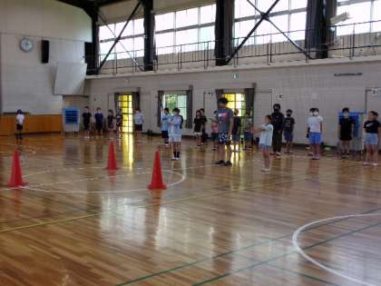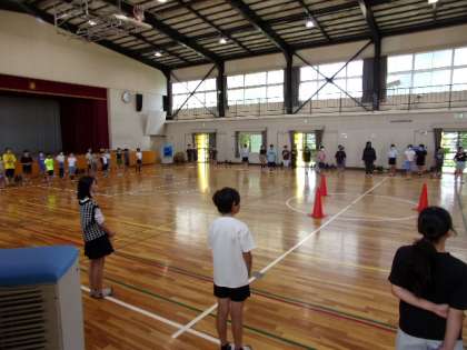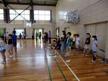 5年生の野外学習が近づいてきています。学年合同で、体育館でキャンプファイヤー練習を行っていました。