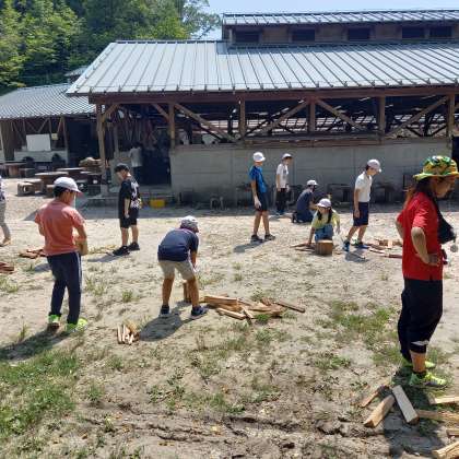 オリエンテーリングから戻り、夕食準備に入りました。これは薪割りの様子です。なたの使い方を教えていただき、安全に気をつけて使いました。だんだん、みんな慣れてきて、上手に割れるようになりました。