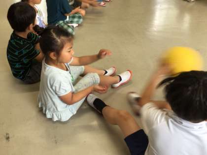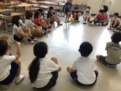 6年生が考えた遊びを縦割り班で楽しみました。この班は、ばくだんゲームです。