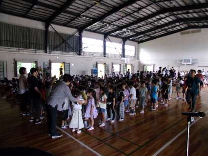 そもそも、全校児童が一斉に体育館に入るということ自体が3年ぶりです。かつては当たり前の光景だったのですが、あまりに久しぶりでしたので、移動や整列の様子も撮影してみました。みんな上手に移動できていました。