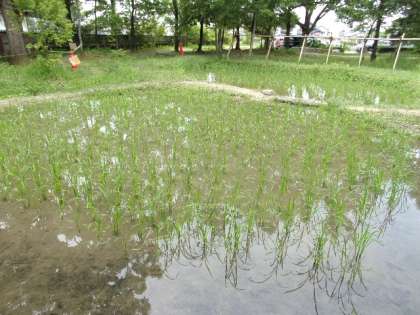 6月上旬に田植えをした田んぼ。かなり、稲が成長してきています。そして、オタマジャクシも相変わらず姿が見られます。