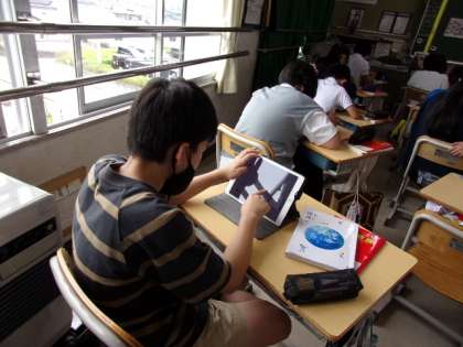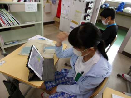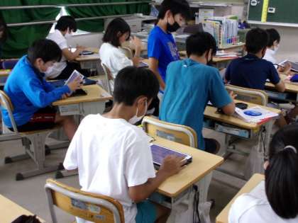 調べた内容を整理し、割り付け(レイアウト)を考えながら、ポスターにまとめていきます。全面的に学習用タブレットを活用していきます。