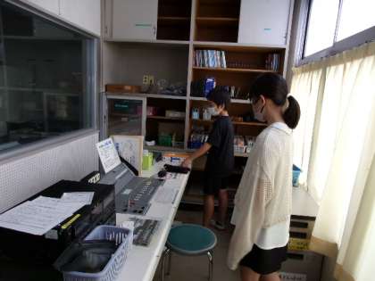 放送委員が、昼の校内放送を行う準備をしている様子です。5,6年生は、全員が委員会に所属して、このように学校のために活動しています。
