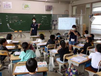 とじこめた水を押すとどうなるのか。自分の考えを、実物や黒板を使いながら説明していました。