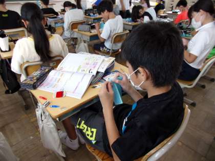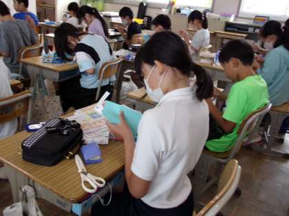 手縫いで、小物を作っています。約1か月前、多くのボランティアの方に教えていただいていた頃と比べると、みんな、驚くほど、技能が上達しています。