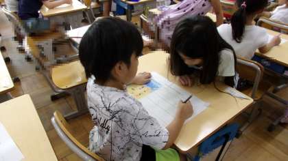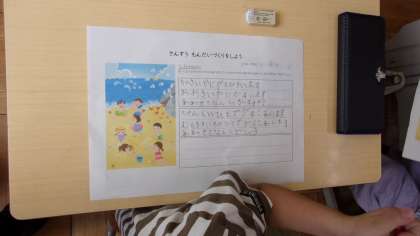 1枚の絵をもとに、たし算の文章問題を作っていました。