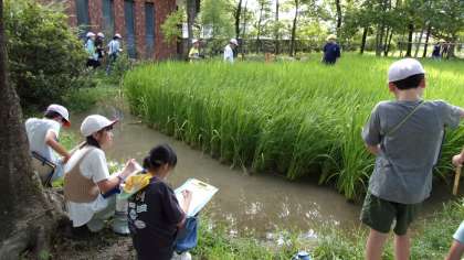 田んぼの稲、夏休みの間にぐんと伸び、穂も出てきました。夏休み明け、初めての観察です。