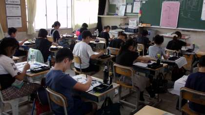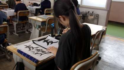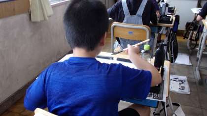 部首「しんにょう」のある漢字について、組み立てを考えながら、形を整えて書いていきます。この日、書いたのは「友達」の2文字ですが、明らかに難しさが異なります。みんな、真剣に慎重に書いていました。