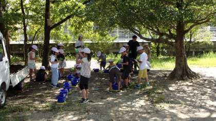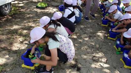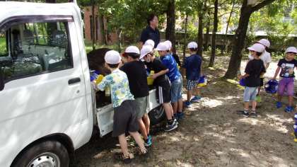 先週金曜日に行われたレタスの苗植えの様子です。暑さ指数の高い時間帯だったので、講師の方に軽トラックを乗り入れていただき、いきいきランド内の日陰で行いました。