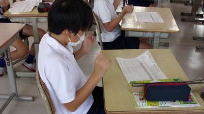 打楽器の音色を活かしてリズムアンサンブルを作ります。そのために、まずは、みんなでリズム打ちをしてみています。確かに、リズムを正確に打てないと、アンサンブルどころではないですよね。みんな、かなり集中して(緊張して)取り組んでいました。
