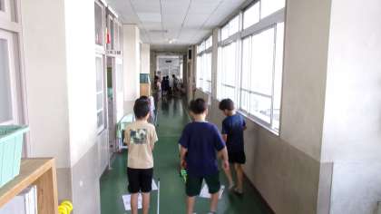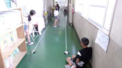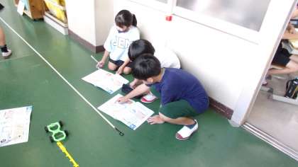 ゴムで動くおもちゃの車。ゴムののばし方を変えると、動く距離はどうなるのかを調べています。正確な記録を取るために、みんな気を付けていました。