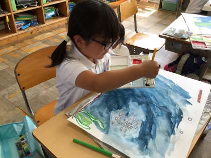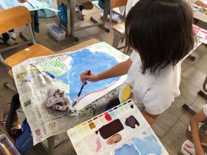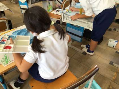 読書感想画を描いています。何色にしようかなと考えながら、隅まで丁寧に塗っています。