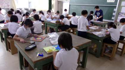 初めて、くぎを使った工作をします。授業で、金づちを使うのも初めてです。慎重に、それでも、楽しそうに活動していました。