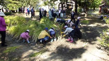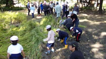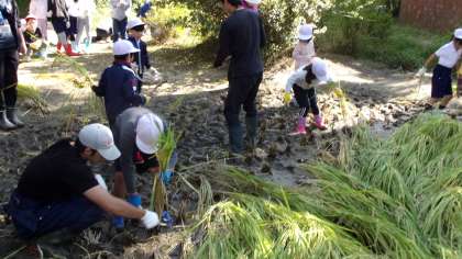 2年生の稲刈り、後半の様子です。写真からも、足元がおぼつかない様子が感じられますが、田んぼ(?)らしく、湿り気を多く含んだ、ねっとりとした地面で、とても歩きにくくなっています。講師の方々は、比較的すいすい歩かれるのですが、子どもたちはとてもそうはいきません。稲刈りをした後の株の上を歩くといいよ…と声をかけられていました。どんなことも、一つ一つ経験です。