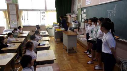 28日(土)〜29日(日)、メグリア本部店で行われたフードドライブの取組に、何人かの6年生も参加しました。多くの人に参加してもらえるように、それ以前(この写真は、18日のものです)には、学校内でも、他学年の教室に行って、自分たちの作ったちらしを配りながら、宣伝(?)しました。写真は、その時の様子です。ちなみに、1年3組です。