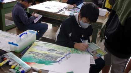 これは、今日の授業の様子です。なお、このクラスが下絵を描いていたのは、10月上旬です。5の2図工「読書感想画 〜銀河鉄道の夜〜」