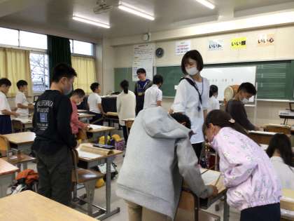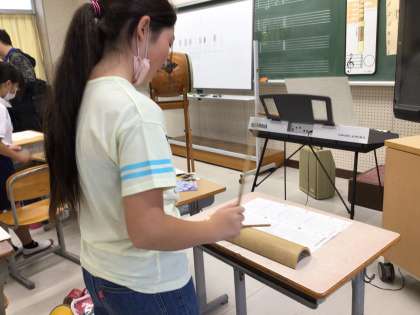 講師の方に教えていただきながら、練習しています。楽譜を見て、友達と教え合う姿も見られます。