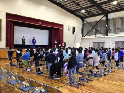 東コースの発表です。神社でのお参りの仕方など、教えてもらったことを紹介しました。みんなでお参りをやってみたり、クイズを出したりして、工夫して発表しました。お世話になった方々に感謝の言葉も伝えました。