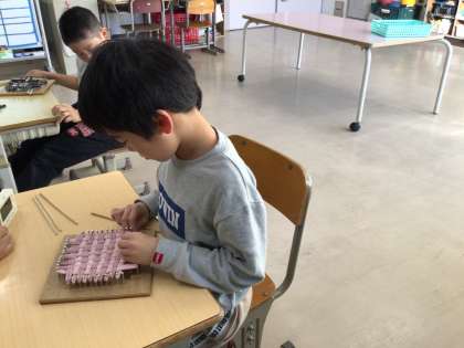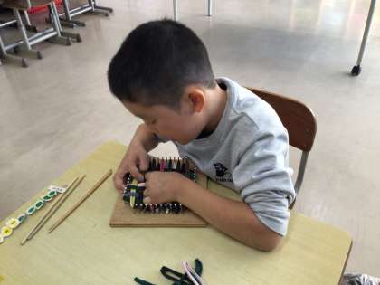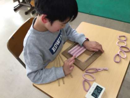 エコたわしを作りました。指先を使って取り組んでいます。