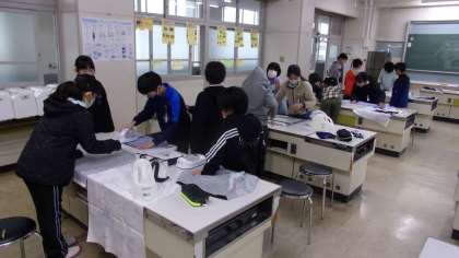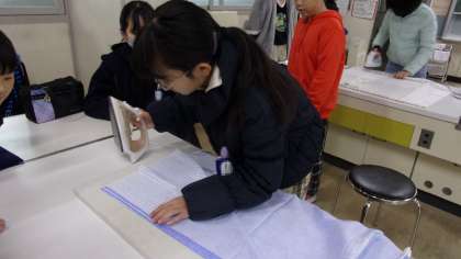 エプロンを制作しています。ミシンを使っていきます。その事前準備として、アイロンを使って、しつけをかけていました。