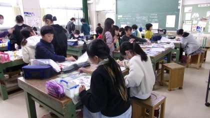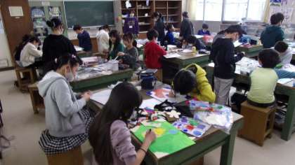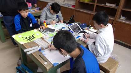 まだ、多くの子は、木に絵を描いている段階です。絵を描いたら、電動糸鋸を使って、これを切っていくことになります。