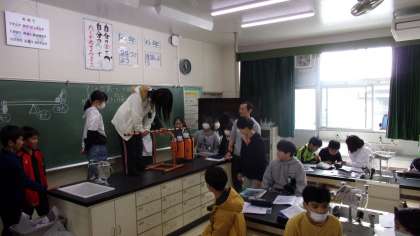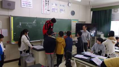 てこの学習の導入です。力点の位置を変えて、おもりをあげてみています。手ごたえの違いを実感できたことで、興味・関心をもって、学習に臨んでいけると思います。