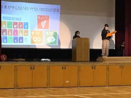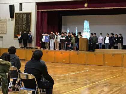 総合的な学習の時間に調べたことや活動したことを発表しました。校内でのあいさつ運動や、手前取りを呼び掛ける活動などをグループの子と協力して伝えました。司会や照明なども分担して自分達で進めました。保護者の方々への提案や活動の感想もありました。
