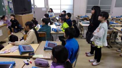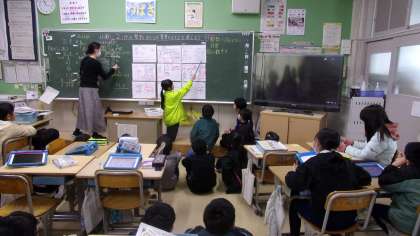 小数に2桁の整数をかけるには、どのようにしたらよいのかを考えていました。それぞれのグループが、それぞれで考えた方法を発表しています。
