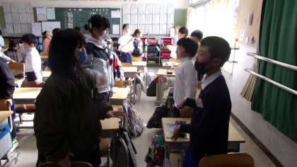 クリスマスに関係のある単語を使って、ビンゴゲームをします。まずは、いろいろな単語を、先生の後について、自分のペアで練習しました。