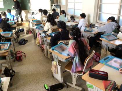 版画の下書きで、自分の顔を描きました。タブレットで顔の写真を撮り、見ながら描きました。4年生から彫刻刀での版画になります。細かく描写すると彫るのが大変な作業になるので、線の簡略化を意識しながら描きました。