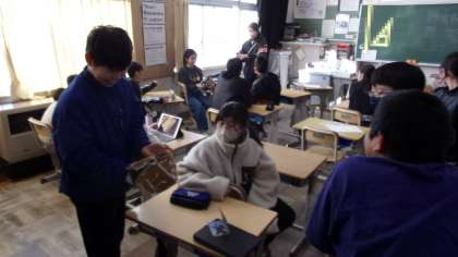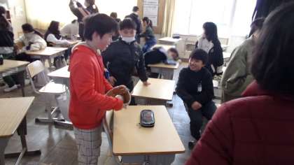 5年1組の様子です。教室内で、グローブをはめ、柔らかく軽いボールを使って、キャッチするなどしていました。記念に写真を撮影している子も、多くいました。