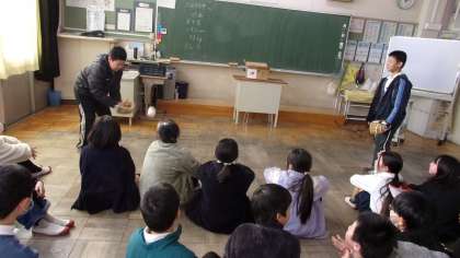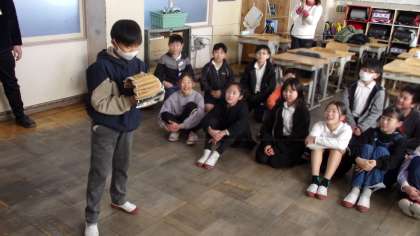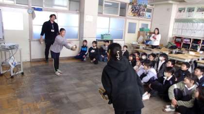 5年2組の様子です、このクラスは、1組と同じく教室で行っていますが、机や椅子を後ろに下げて、スペースを作り、交代で軽くキャッチボールをしていました。