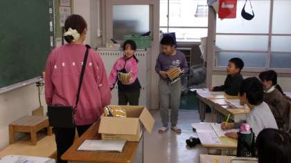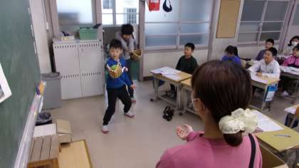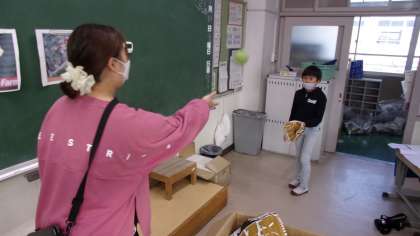 3年1組です。教室の前の方で、担任の先生が投げたボールをグローブでキャッチしています。やはり、ボールが捕れると嬉しそうです。あまりグローブに触ったことのない子の中には、自分が捕れたこと自体に驚いている子もいました。とても、ほのぼのとして、素敵な時間でした。