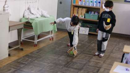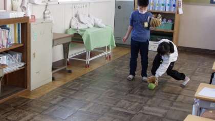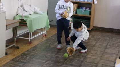 2年4組は、教室が少し広いので、教室の中で行っていました。担任の先生が投げたゴロを捕って、投げ返していました。