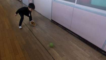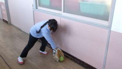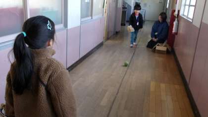 1年1組です。廊下を使って、子どもたち同士で、ゴロのキャッチボールをしていました。