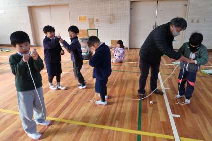 おじいちゃん、おばあちゃん、地域の方など、6名の方に講師として来ていただきました。これらの写真は、始めの会、あやとり、こまの様子です。