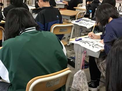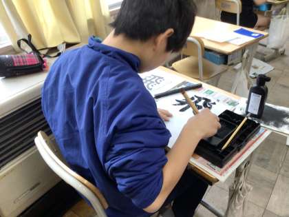 「飛行」という字を書きました。「飛」が大きくなり過ぎないように文字の大きさに気を付けて書いています。来週は清書です。
