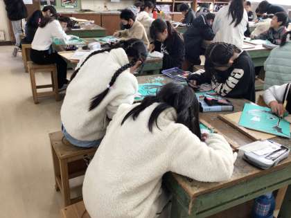 自分の顔を丁寧に彫り進めていました。初めての彫刻刀で上手に彫っています。どの子も真剣ですね。