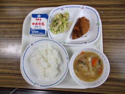 昨日の給食です。汁物は、ぱっと見たところは普通の味噌汁ですが、玄米団子汁でした。中に、玄米の団子が入っていて、おいしかったです。