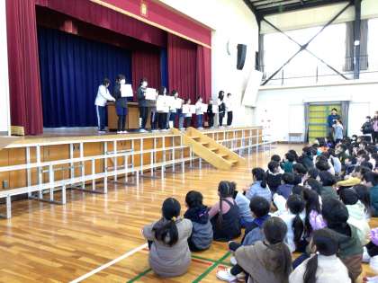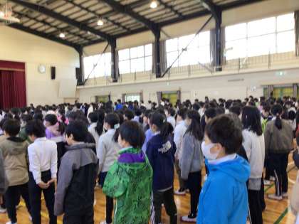 今年度最後の全校集会を行いました。書き初め大会などの表彰をして、全員で校歌を歌いました。