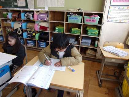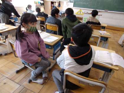 4分の1のテープをさらに半分に折ると、どんな大きさになるのでしょう。まずは自分で、次にペアで、そして、みんなで考えていました。