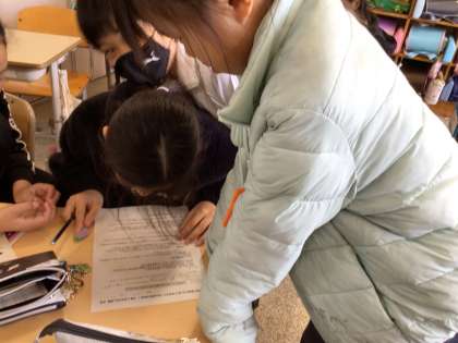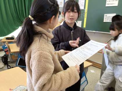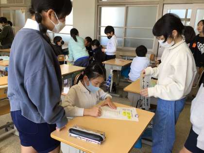 今日のなかよし活動の準備をしています。役割分担をしたり話す練習をしたりしました。6年生に感謝の気持ちを伝えるために頑張ります。